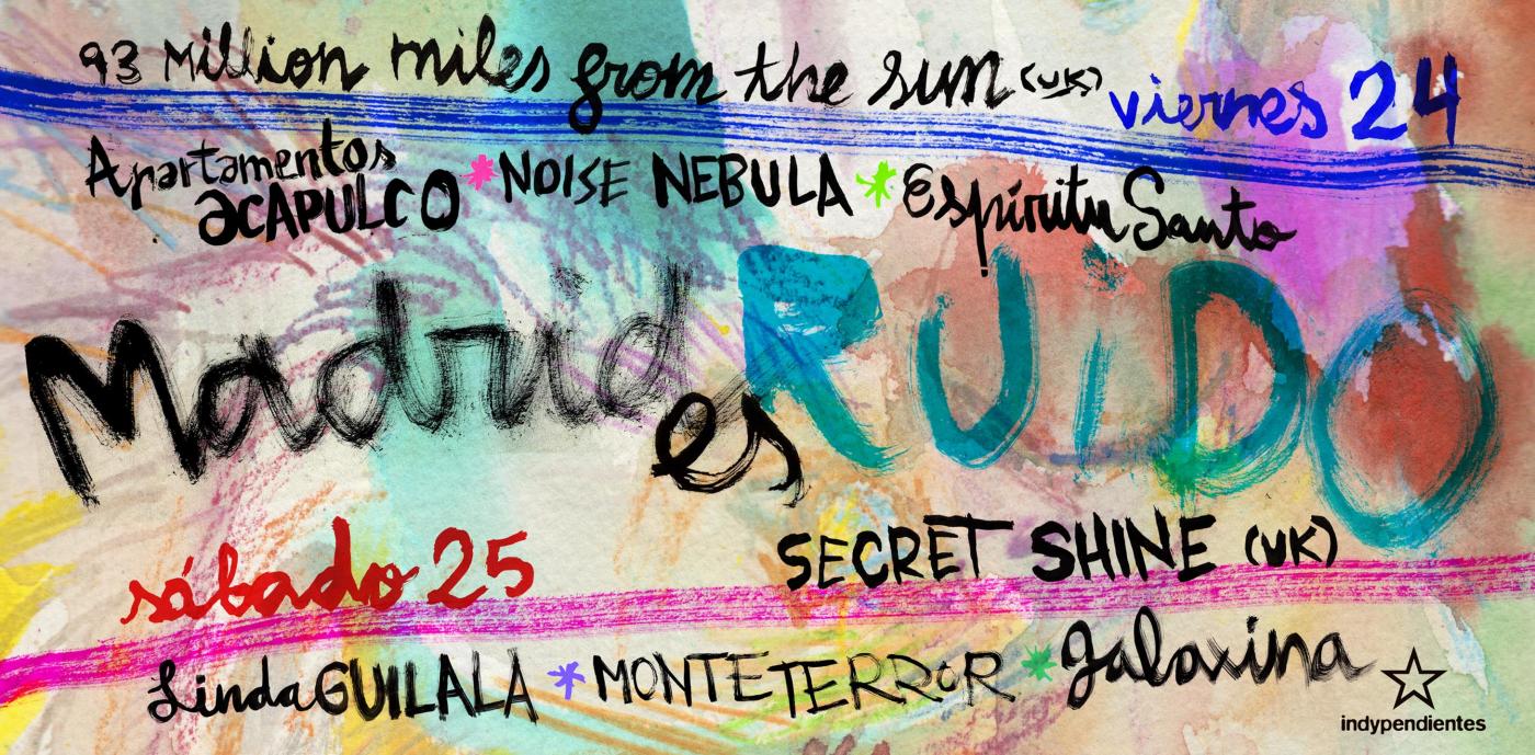 La promotora Indypendientes presenta el festival MADRID ES RUIDO, en el que se darán cita una plétora de agrupaciones singulares. Desde bandas escoradas hacia el pop experimental y shoegaze como los británicos Secret Shine, pasando por la abstracción acompasada de 93 Million Miles From The Sun, para desembocar en propuestas nacionales tan apetecibles como el noise armónico de Linda Guilala, los granadinos Apartamentos Acapulco, o el nervio almeriense de Monte Terror y Galaxina; sin olvidar a dos jóvenes y potentes referencias madrileñas como son Noise Nébula y Espíritu Santo.