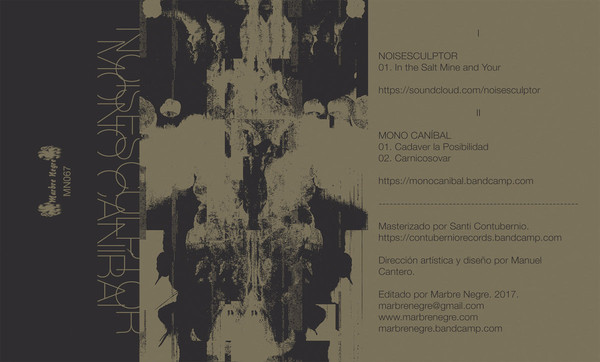 Dos proyectos tan abstractos como inquietantes estrechan la mano en un lanzamiento propuesto por Marbre Negre. Noisesculptor y Mono Canibal configuran una casete indómita y muy convincente. Alta calidad experimental.