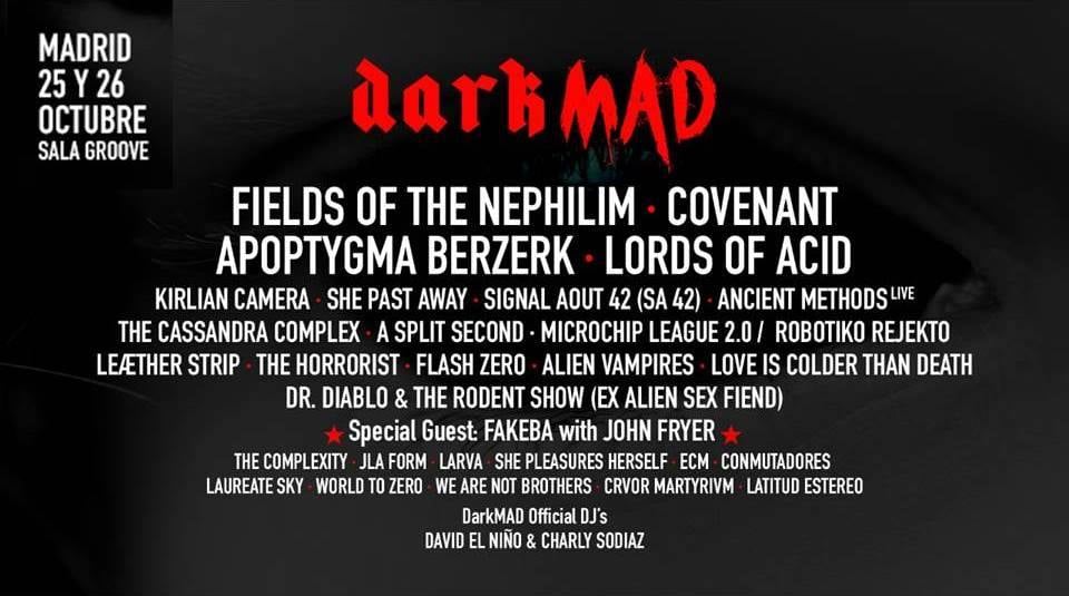 Madrid ha sido la ciudad elegida para celebrar el primer certamen de DARKMAD, un festival que recoge a un gran número de grupos emblemáticos relacionados con la música oscura en todas sus subvertientes, contando con la presencia de Fields Of The Nephilim, Covenant, Apoptygma Berzerk, Lords Of Acid, Alien Vampires, Kirlian Camera, Ancient Methods, Signal Aout (SA 42), Microchip League 2.0 / Robotiko Rejekto, The Cassandra Complex, She Past Away, Dr. Diablo & The Rodent Show (ex Alien Sex Fiend), A Split Second, Flash Zero, Love Is Colder Than Death, Leaether Strip, The Horrorist, Fakeba + John Fryer, The Complexity, JLA Form, Larva, ECM, World to Zero, Latitud Estero, Conmutadores, She Pleasures Herself, Laureate Sky, Crvor Martyrivm, We Are Not Brothers, David El Niño y Charly Sodiaz.