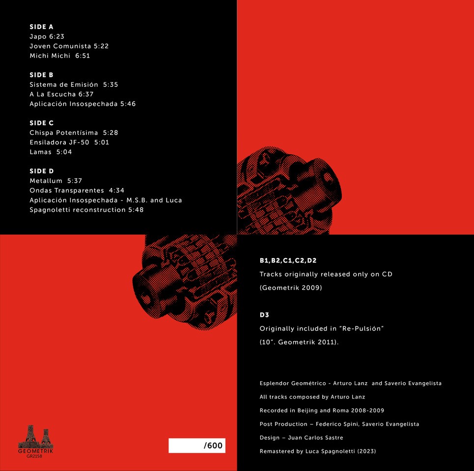 Pues bien, Pulsión salió al mercado en una edición limitada a quinientas copias en vinilo que no tardó en agotarse, y desde entonces únicamente se ha podido conseguir en CD, que como premio de consolación aportaba cinco cortes extra que no aparecían en el primer formato comentado. Con esta nueva edición, los fans de EG están de enhorabuena, ya que Geometrik ha decidido publicar un doble vinilo en el que se incluyen estos cinco devastadores temas más una revisión de “Aplicación Insospechada” realizada por MSB y Luca Spagnoletti.