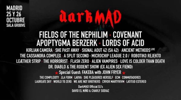 Madrid ha sido la ciudad elegida para celebrar el primer certamen de DARKMAD, un festival que recoge a un gran número de grupos emblemáticos relacionados con la música oscura en todas sus subvertientes, contando con la presencia de Fields Of The Nephilim, Covenant, Apoptygma Berzerk, Lords Of Acid, Alien Vampires, Kirlian Camera, Ancient Methods, Signal Aout (SA 42), Microchip League 2.0 / Robotiko Rejekto, The Cassandra Complex, She Past Away, Dr. Diablo & The Rodent Show (ex Alien Sex Fiend), A Split Second, Flash Zero, Love Is Colder Than Death, Leaether Strip, The Horrorist, Fakeba + John Fryer, The Complexity, JLA Form, Larva, ECM, World to Zero, Latitud Estero, Conmutadores, She Pleasures Herself, Laureate Sky, Crvor Martyrivm, We Are Not Brothers, David El Niño y Charly Sodiaz.